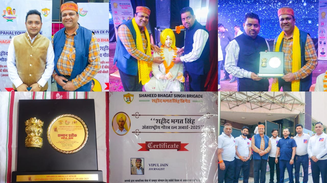 नई दिल्ली।नई दिल्ली,सिविल लाईन्स स्थित शाह आड़िटोरियम में उड़ान एक पहल फाउंडेशन द्वारा शहीद भगत सिंह अन्तर्राष्ट्रीय गौरव अवार्ड-2025 का भव्य आयोजन किया गया।कार्यक्रम में देश-विदेश की जानी-मानी हस्तियों ने शिरकत की।समारोह में इंटरनेशनल अवार्ड व उत्तर प्रदेश सरकार द्वारा सम्मानित वरिष्ठ पत्रकार विपुल जैन बागपत को शहीद भगत सिंह अन्तर्राष्ट्रीय गौरव अवार्ड-2025 से इंटरनेशनल हयूमन राईट प्रोटेक्शन काउंसिल के फाउंडर व चेयरमैन डाक्टर टीएम ओंकार द्वारा पुरस्कृत किया गया।आयोजनकर्त्ता उड़ान एक पहल फाउंडेशन के चेयरमैन दीपक मित्तल ने बताया कि शहीद भगत सिंह अन्तर्राष्ट्रीय गौरव अवार्ड-2025 ऐसे लोगों को प्रदान किया गया है,जिन्होंने अपने कार्यों से मानवता को विश्वभर में गौरवान्वित किया है।उन्होंने बताया कि विपुल जैन एक बेहतरीन इंसान है और पूर्व में भी इंटरनेशनल और नेशनल स्तर की अनेकों संस्थाओं और उत्तर प्रदेश सरकार द्वारा उनको सम्मानित किया जा चुका है।दीपक मित्तल ने बताया कि विपुल जैन निष्पक्ष पत्रकारिता के माध्यम से लोगों को इंसाफ दिलाने और समाज की छुपी हुई प्रतिभाओं को देश व दुनिया के सामने लाने में भी महत्वपूर्ण भूमिका अदा करते है और साम्प्रदायिक सौहार्द की अनुपम मिसाल है।विपुल जैन ने अपनी इस उपलब्धि का श्रेय अपने दादा नरेन्द्र जैन, पिता सुदर्शन जैन,माता रेनु जैन,गुरूजनों सहित उन सभी समस्त शुभचिंतकों व सहयोगियों को दिया,जिन्होंने उनको नेक कार्याें को करने के लिए जागरूक किया और जरूरतमंदो की सहायता करने के लिए तन-मन-धन से हर कदम पर उनका साथ दिया।विपुल जैन ने कहा कि मेरी इस उपलब्धि में वे सभी महान लोग बराबर के साझेदार है,जिनके सहयोग, आर्शीवाद और प्रार्थनाओं से वर्ष 2023-2024 में मुझे नवजीवन प्राप्त हुआ है। समारोह में दिल्ली की मुख्यमंत्री रेखा गुप्ता,पूर्व मेजर जनरल डाक्टर जीडी बक्शी,यादविन्द्र सिंह सिंधू सहित देश-विदेश की जानी-मानी हस्तियों को आमंत्रित किया गया था।
