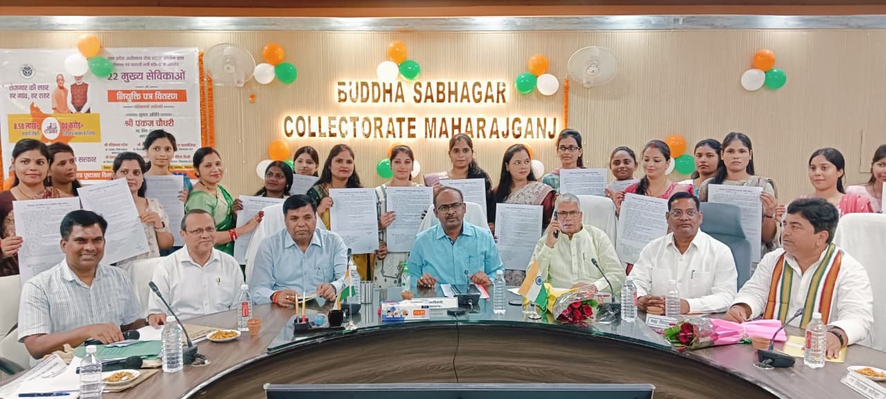 महराजगंज। कलेक्ट्रेट सभागार में मंगलवार को आयोजित कार्यक्रम में बाल विकास एवं पुष्टाहार विभाग की ओर से नवनियुक्त मुख्य सेविकाओं को नियुक्ति पत्र सौंपे गए। इस अवसर पर विधायक पनियरा श्री ज्ञानेंद्र सिंह, विधायक सदर श्री जय मंगल कन्नौजिया, विधायक फरेंदा श्री वीरेंद्र चौधरी तथा जिलाधिकारी श्री संतोष शर्मा ने संयुक्त रूप से चयनित अभ्यर्थियों को शुभकामनाएं दीं।