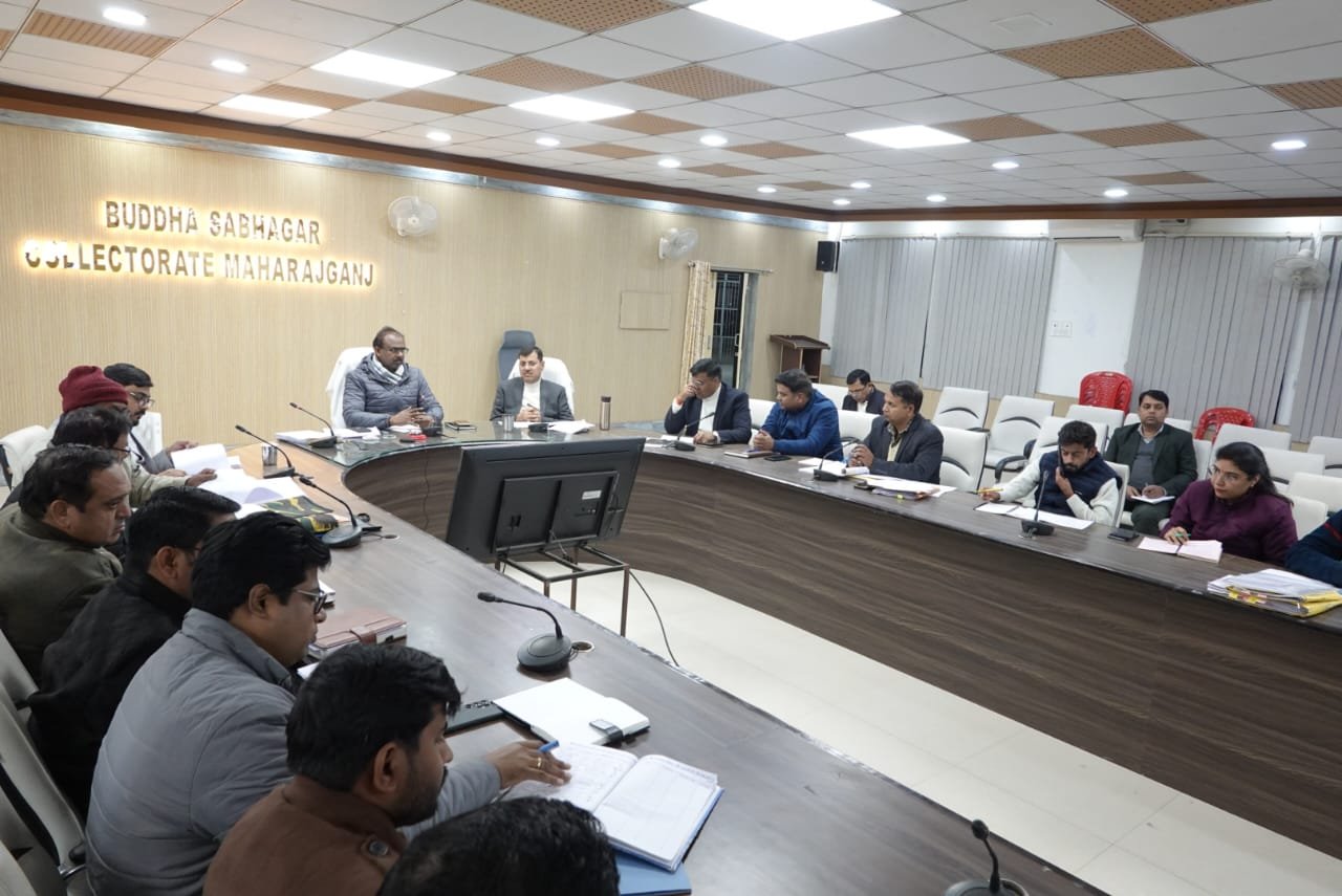 महराजगंज, 29 दिसंबर 2025 को जिलाधिकारी श्री संतोष कुमार शर्मा ने सोमवार को कलेक्ट्रेट सभागार में आयोजित बैठक में राजस्व एवं विकास कार्यों से संबंधित विभिन्न योजनाओं की सीएम डैशबोर्ड पर प्रगति की समीक्षा की। बैठक के दौरान उन्होंने सभी विभागों को योजनाओं की प्रगति में तेजी लाने और लक्ष्य के अनुरूप परिणाम सुनिश्चित करने के निर्देश दिए।